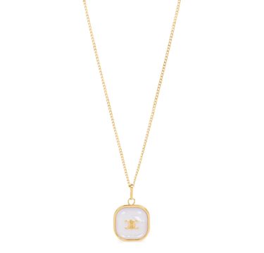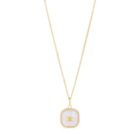 Entdecke Celine's Triomphe prendant halskette aus perlmutt und messing mit gold-finish. Dieses edle Schmuckstück hat eine Gesamtlänge von 64 cm, verstellbar auf 62 cm, mit einem zusätzlichen Einstellring bei 60 cm. Die gravierte Celine Paris-Signatur und der Karabinerverschluss vervollständigen das stilvolle Design.