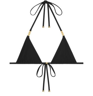 Entdecke Celines Triomphe-Triangeloberteil aus mattem Jersey mit klassischem Schnitt und edlen Triomphe-Gourmette-Ketten vorne und an den Trägern. Genieße die Bindeschlüsse mit stilvollen Triomphe-Endkappen für einen modernen, eleganten Look.