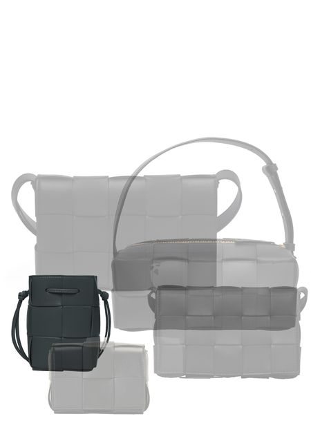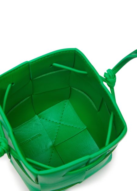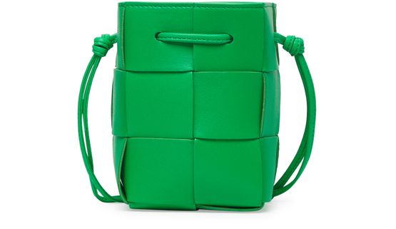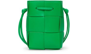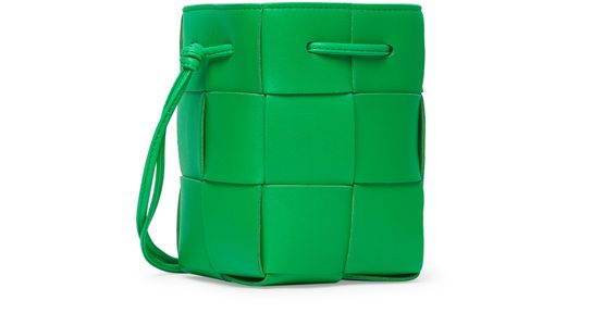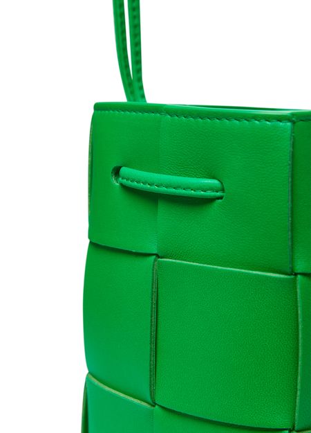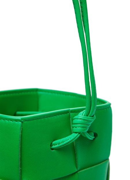 Die kleine Bucket Bag „Cassette” aus dem Hause Bottega Veneta hat einen Tragriemen und wird über der Schulter oder umgehängt getragen. Sie besteht aus Leder und hat ein einziges Fach, das mit einer Schnur geschlossen wird.