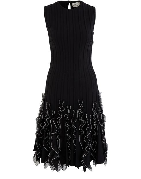 Ein Hauch von leuchtender Farbe ziert dieses Volantkleid von Alexander McQueen. Die wirbelnden Rüschen dieses ärmellosen und gerippten Kleids bringen Relief und Weiblichkeit.