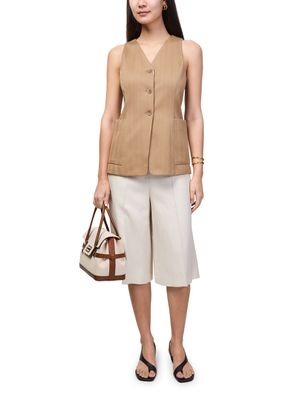 Genieße die Weste aus Baumwolle von Max Mara – kurz, ärmellos und ohne Kragen für einen modernen Look. Knopfverschluss und praktische Seiten- sowie aufgesetzte Taschen sorgen für Funktionalität. Das weiche Baumwollmaterial macht dieses Modell vielseitig kombinierbar, von leger bis elegant.