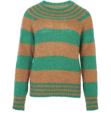 Der zweifarbige Pullover der Marke Alexa Chung aus Mohair und Wolle weist abwechselnd feine und breite Streifen auf, die durch einen leicht stehenden gerippten Kragen hervorgehoben werden.