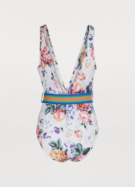 Der Badeanzug Allia aus Mischpolyamid kombiniert die romantischen Blumenmotive des Hauses Zimmermann mit der Originalität eines mehrfarbigen Bandeau-Gürtels.