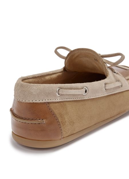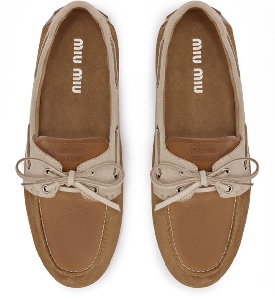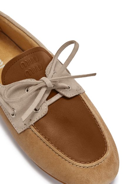 Entdecken Sie die Loafer aus Leder und Wildleder von Miu Miu, gefertigt mit einer eleganten runden Zehenpartie und einem geschlossenen Design. Der Schnür- und Riemenverschluss sorgt für einen sicheren Halt, während kontrastierende Details und ein geprägtes Logo eine moderne Note verleihen. Eine logobedruckte Innensohle und ein tonales Futter runden diese anspruchsvollen Schuhe ab.