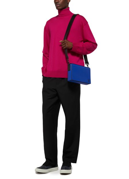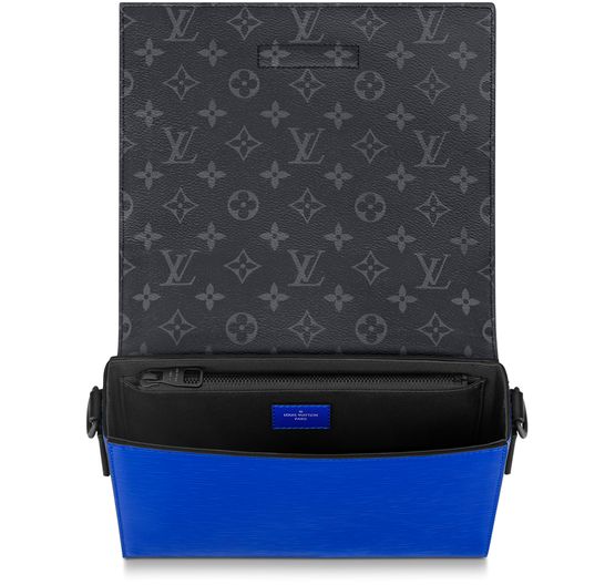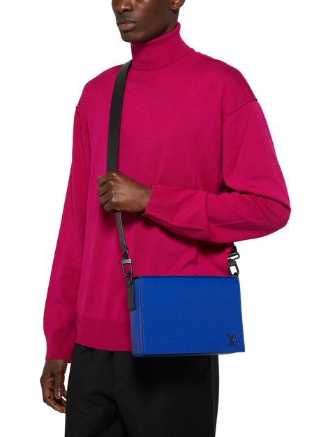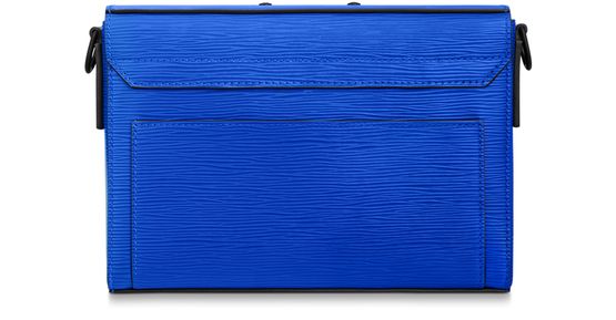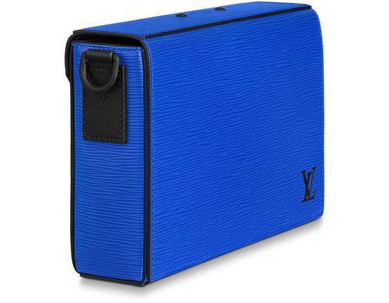 Die von den Koffern des Hauses Louis Vuitton inspirierte Box Messenger Tasche ist in geprägtem Epi Leder gearbeitet. Ihr breiter, verstellbarer Schulterriemen wird von einer übergroßen mattschwarzen LV Signatur aus Metall geschmückt. Der Überschlag mit einem Magnetverschluss präsentiert sich an seiner Innenseite in Monogram Eclipse Canvas und ermöglicht einen einfachen Zugriff auf den Inhalt.
