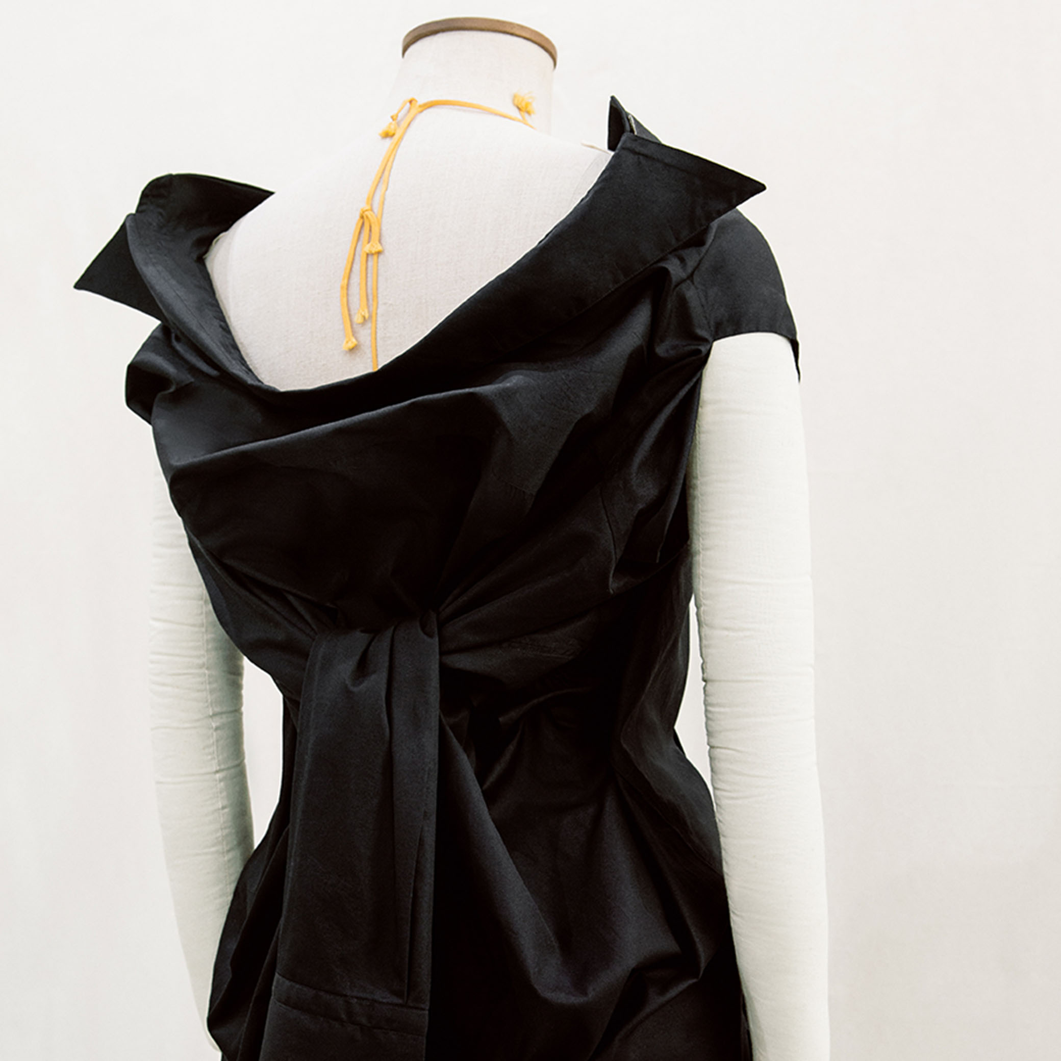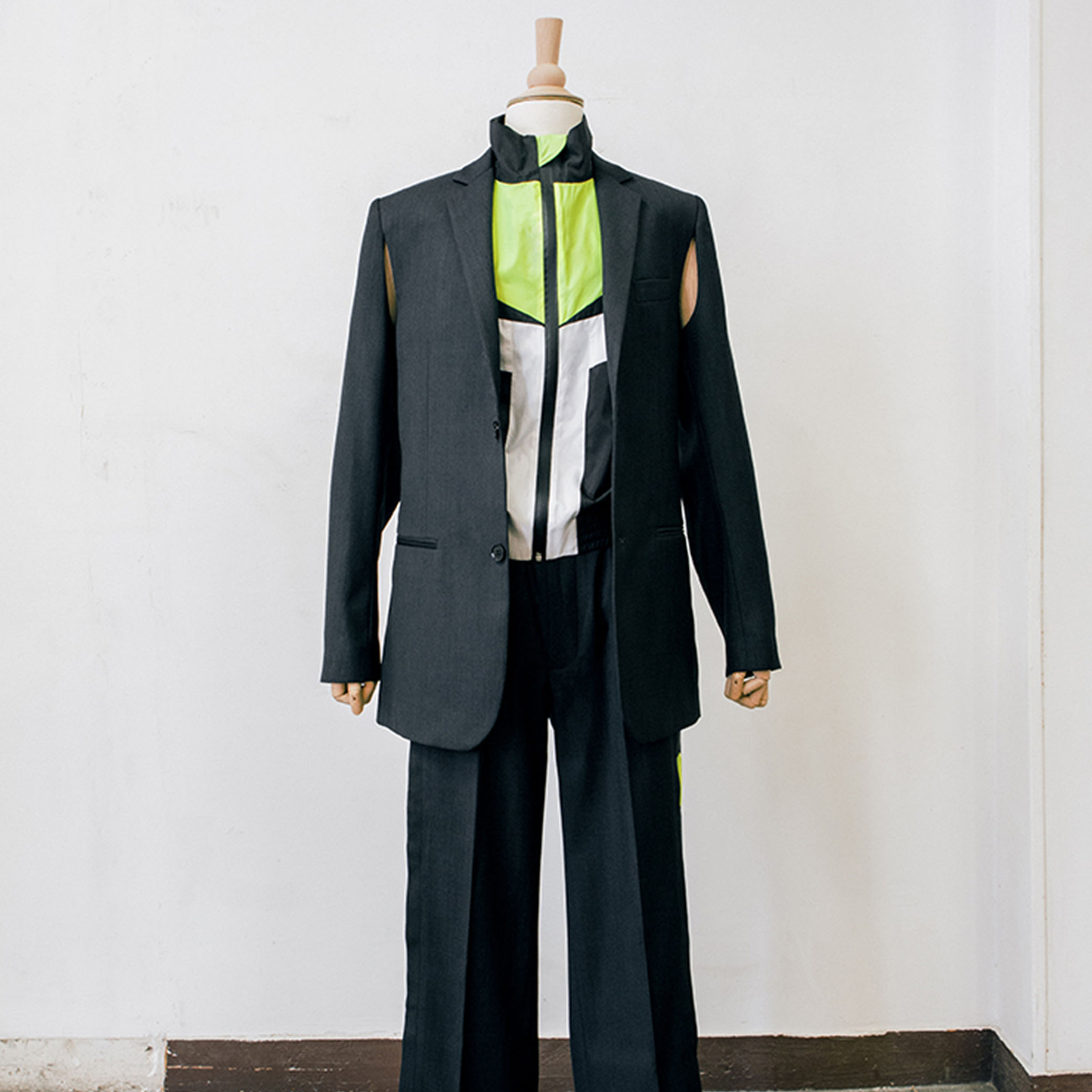 Die entschlossene und im Aufbau destrukturierte Setchu-Silhouette betont den funktionalen Aspekt der Kleidung, mit Reißverschlussteilen, die die Orient-Okzident-Vision des Designers Satoshi Kuwata veranschaulichen.