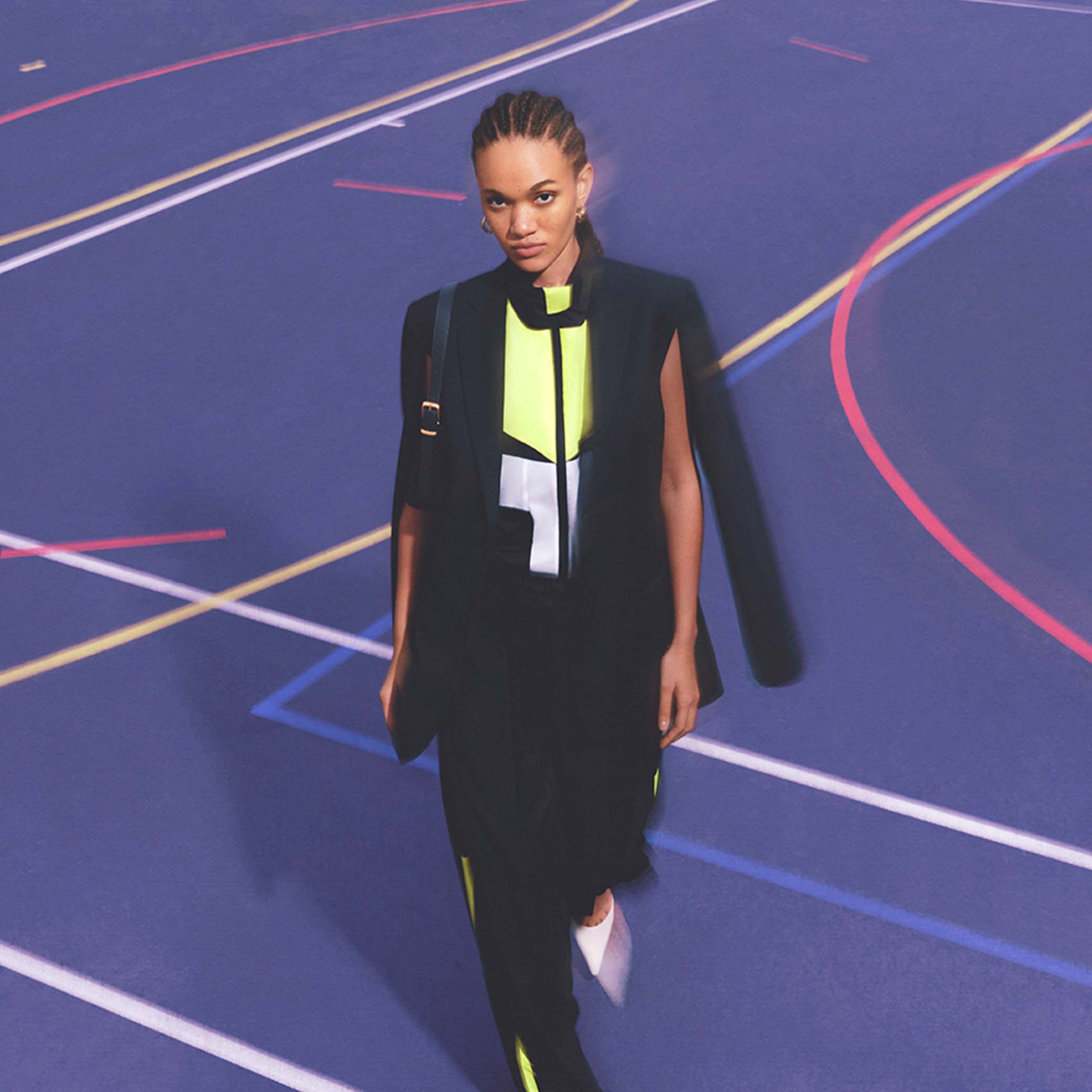 Die Bettter-Silhouette ist eine Ode an die Stärke der Frauen. Ihr modernes, sportliches und angenehm zu tragendes Kostüm aus einem Deadstock-Stoff kombiniert sie mit einer Reißverschluss-Windjacke zu einem Look in den Farben Grau und Neongelb.