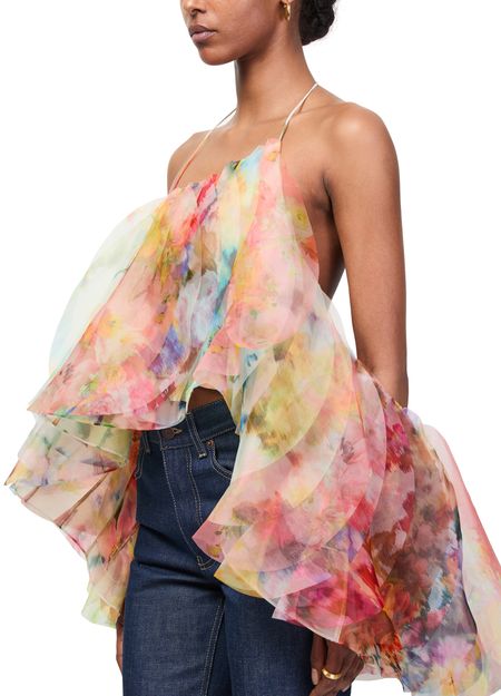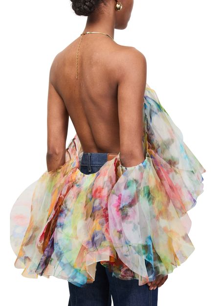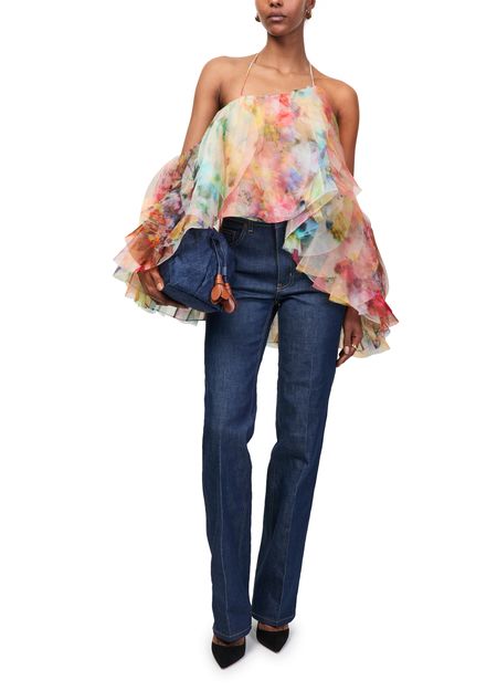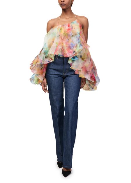Erlebe das Caraco mit Printmotiv Luna von Zimmermann – ein stilvolles Top mit freier Schulterpartie und kurzen Rüschenärmeln. Der mehrfarbige Druck sorgt für einen modernen Akzent und lässt sich vielseitig zu Hosen oder Röcken kombinieren.