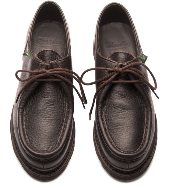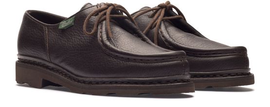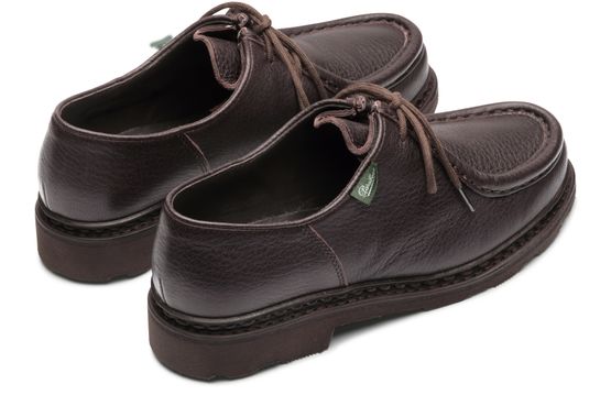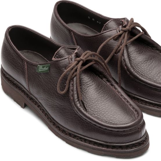 Erlebe Paraboots Derbys Michael, formelle Schnürschuhe aus genarbtem Leder mit Blockabsatz und dicker Außensohle. Die runde Spitze und die logobedruckte Innensohle verleihen diesem eleganten Design Komfort und Stil für jeden Anlass.