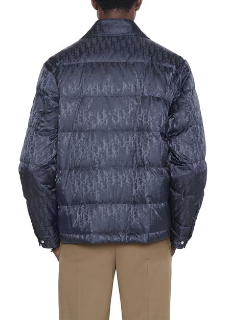 Entdecke Dior's Dior Oblique Steppjacke mit dem Ton-in-Ton-Dior Oblique Jacquard, dem markanten schwarzen 'DIOR' Logo-Patch am linken Ärmel und dem stilvollen Umlegekragen. Der Zwei-Wege-Reißverschluss ist mit 'DIOR'-gravierten Zippern und Druckknöpfen veredelt, was Eleganz verleiht.