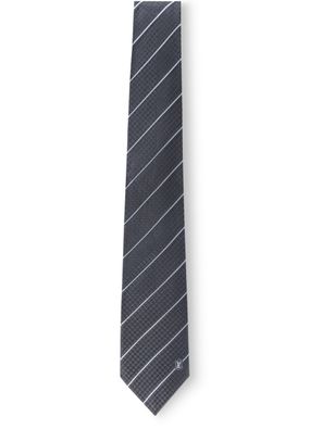 Diese stilvolle Ecu Krawatte aus glänzender Seide kombiniert ein Petit Damier-Motiv mit sich farblich abhebenden schmalen Streifen. Ein dezentes Wappen mit LV Initialen rundet das Design ab.