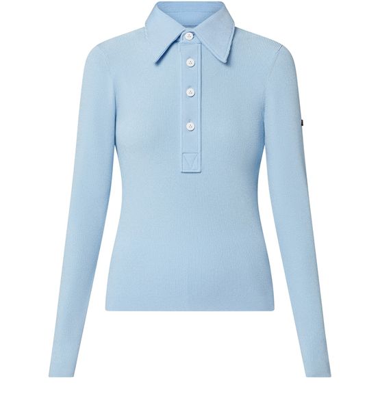 Dieses klassische und in dieser Saison neu interpretierte Polohemd zeichnet sich durch eine figurbetonte Silhouette aus, die sich in einem Strickgewebe aus Viskose mit fein geripptem, leicht glänzendem Finish zeigt. Das Modell verfügt über ein elegantes, langärmliges Design, wobei eine kursive Vuitton Signatur einen Ärmel dezent akzentuiert. Der verspielt betonte Kragen mit Knopfleiste vervollständigt den sportiven Look.