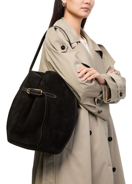 Genieße die große Beuteltasche mit Gürtel von Liffner, gefertigt aus edlem Veloursleder und mit einem einzelnen Griff. Gold-Finish-Details und kontrastierende Nähte setzen stilvolle Akzente, während das großzügige Innenfach und das Reißverschlussfach für praktische Raffinesse sorgen.