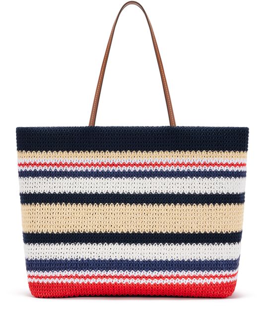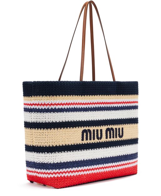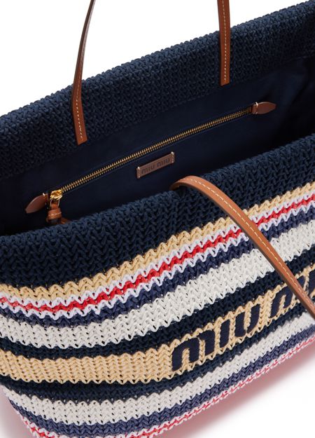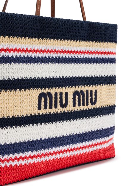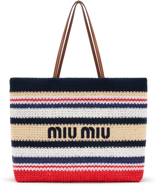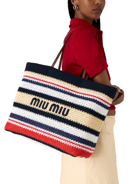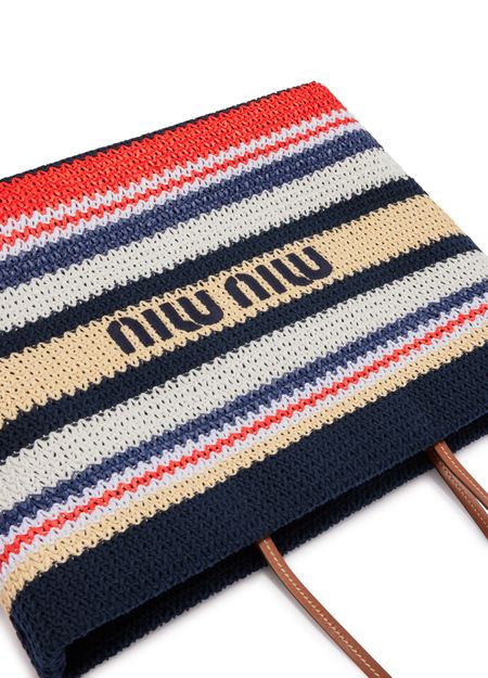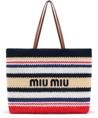 Genieße die große gehäkelte Tragetasche von Miu Miu mit markantem Streifendruck und zwei Henkeln. Das gestickte Logo auf der Vorderseite betont die hochwertige Verarbeitung. Geräumig und stilvoll, vereint diese Tasche moderne Ästhetik mit praktischer Vielseitigkeit für jeden Tag.