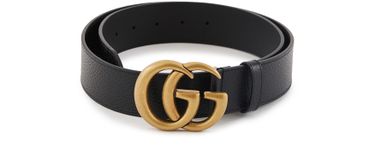 MIt dem Gürtel GG präsentiert Gucci ein verstellbares Accessoire aus genarbtem Leder. Das unifarbene Modell ist mit einer charaktervollen goldfarbenen Schnalle verziert.