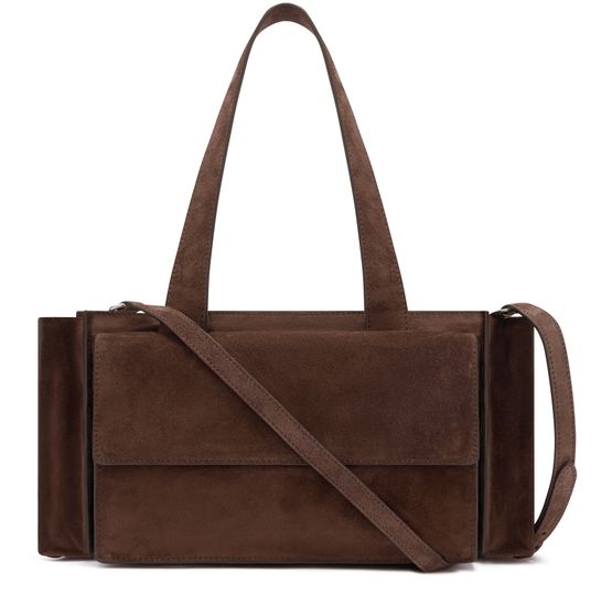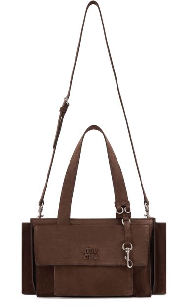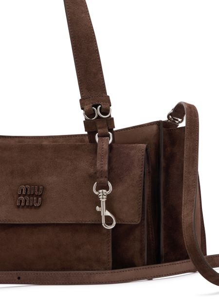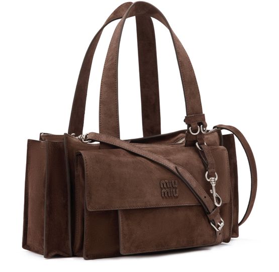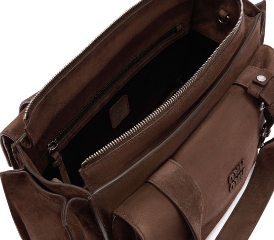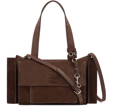 Erlebe die Handtasche mit mehreren Fächern von Miu Miu, gefertigt aus edlem Veloursleder mit zwei Henkeln und einem dünnen, verstellbaren Trageriemen. Großzügiges Innenfach, Reißverschlusstasche und Außentaschen bieten Funktionalität, während das geprägte Logo und das Metallic-Finish stilvolle Akzente setzen.