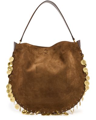 Genieße die Hobo-Tasche Oskan Soft von Isabel Marant, gefertigt aus weichem Veloursleder mit einem einzelnen Griff. Das großzügige Innenfach und das Reißverschlussfach bieten Funktionalität, während gold- und metallic-finish sowie sichtbare Steppnähte für einen stilvollen, zeitgemäßen Look sorgen.