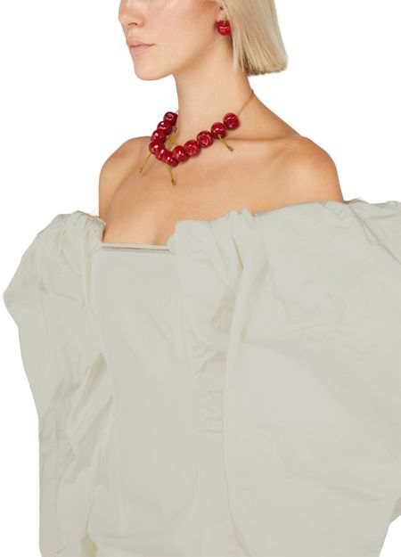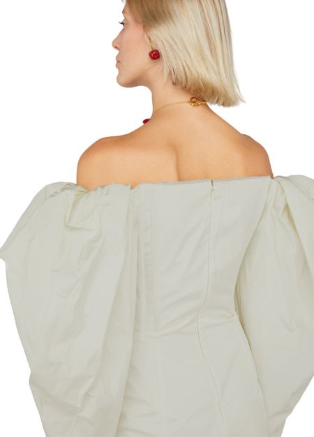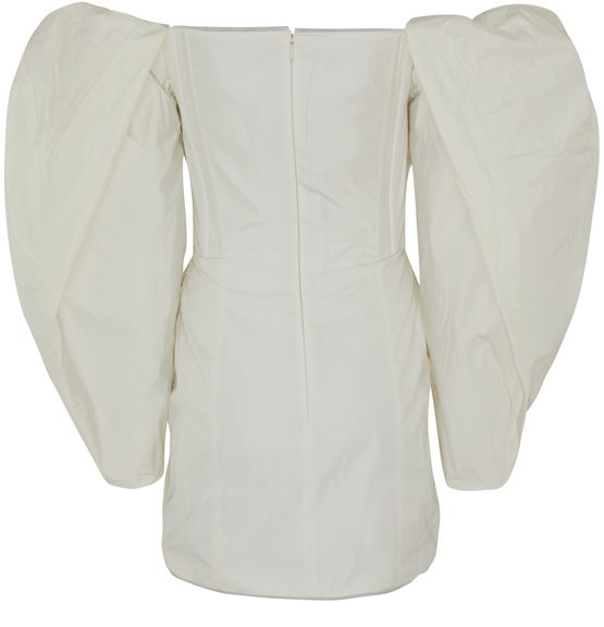 • Beschreibung : Kurzes Kleid, freie Schultern, puffärmel, raffdetails, körperbetonter Schnitt.