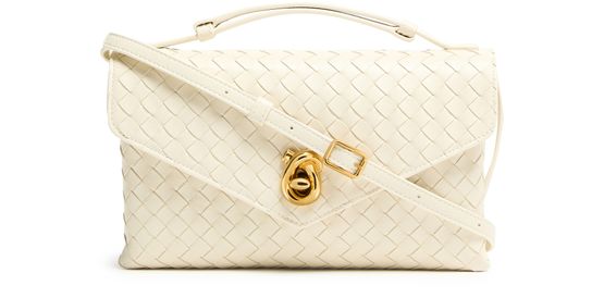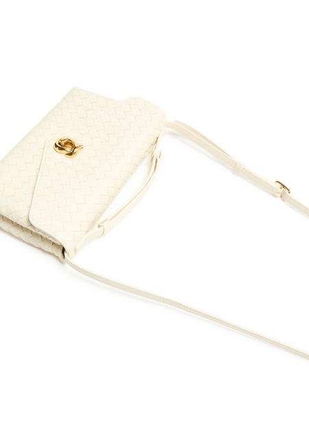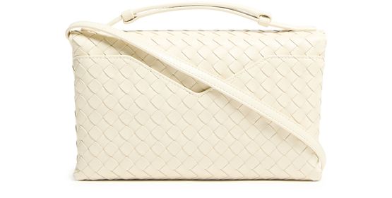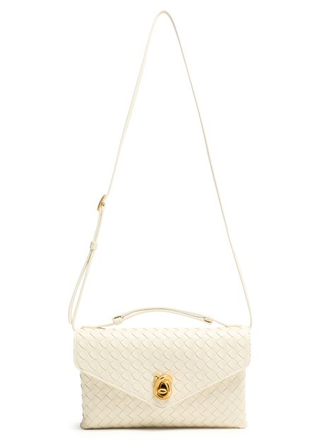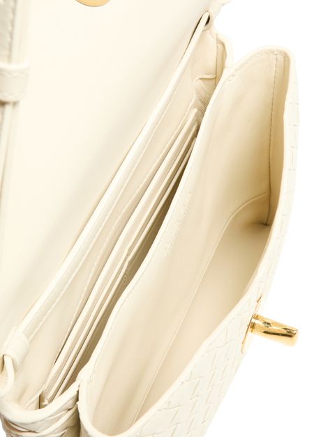 Genieße die intrecciato-schultertasche von Bottega Veneta, die mit kunstvoller Intrecciato-Flechttechnik, gold-finish und sichtbaren Steppnähten begeistert. Ein dünner, verstellbarer Trageriemen, Klappenverschluss sowie Kartenschlitze und eine Hintertasche sorgen für stilvolle Funktionalität.