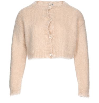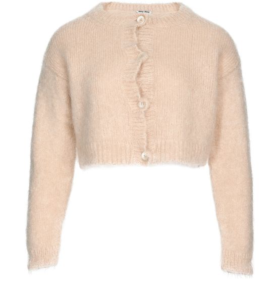 Miu Miu entwirft einen kurzen Cardigan, der eine authentische Linie mit der Weichheit von Mohair verbindet. Ob über einem Top oder einem Tanktop, diese kleine Strickweste nimmt Bolero-Akzente an.
