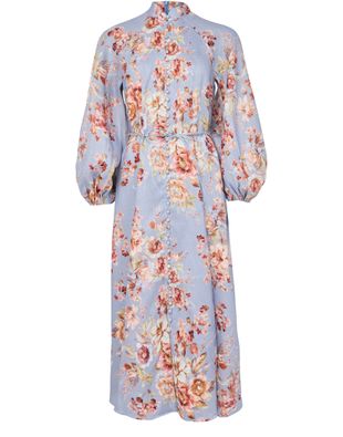 Genieße das langes Billow-Kleid Awaken Zimmermann, ein Midikleid mit floralem Druck. Der hochgeschlossene Ausschnitt und die Fledermausärmel sorgen für eine fließende Silhouette, während Mao-Kragen und stoffbezogener Knopf stilvolle Akzente setzen. Vielseitig für Tag und Abend einsetzbar.