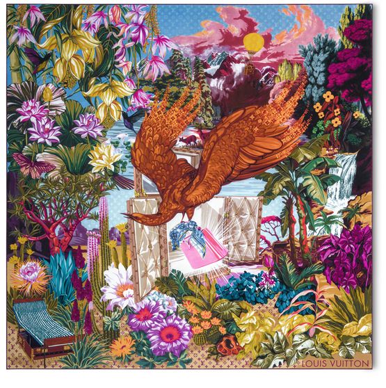 Das Majestic LV Carré aus reiner Seide ist eine eloquente Ode an die Werte und das Erbe des Hauses Louis Vuitton. Seinen Mittelpunkt bildet ein wunderschöner Phönix, ein Symbol für Erneuerung und Beständigkeit. Er ist von einer üppigen Landschaft umgeben, die mit historischen Louis Vuitton Koffern akzentuiert ist. Ein Hintergrund mit einem Monogram-Motiv verleiht diesem farbigen und auffallend originellen Accessoire eine dezente Signatur.