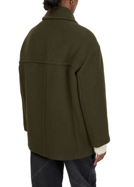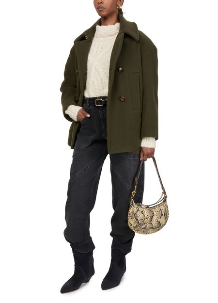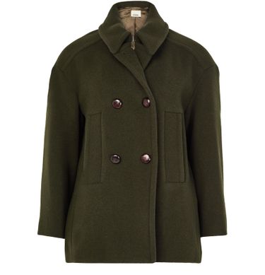 Entdecke Isabel Marants Mantel Fiby, ein regular fit Modell mit zeitlosem Charme und klassischer Überzieher-Silhouette. Die kurze Länge und der Kragen verleihen ihm modernen Reiz, während lange Ärmel und die zweireihige Knöpfung ein raffiniertes Finish bieten. Paspelierte Pattentaschen sorgen für praktische Eleganz bei diesem stilvollen Must-have.