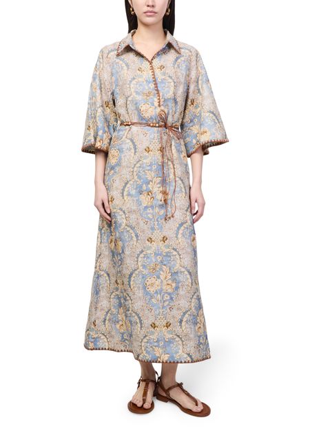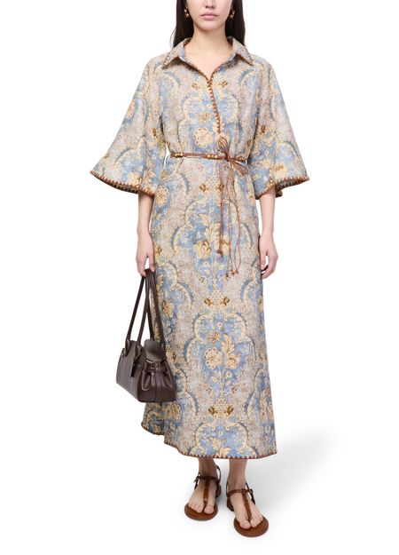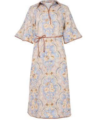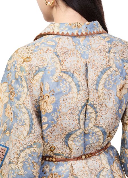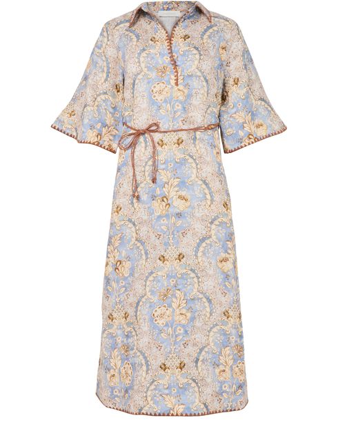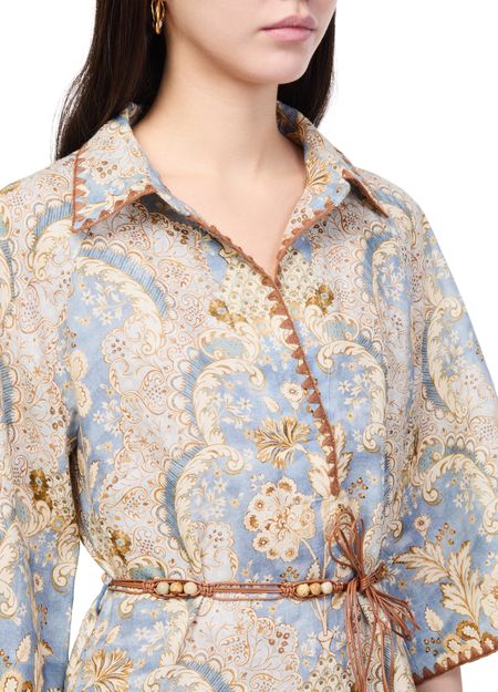 Genieße das Midikleid Daylight von Zimmermann, das mit floralem Druck und eleganten dreiviertel Glockenärmeln begeistert. Ein Anzugkragen, gebogte Ränder und Steppkanten unterstreichen die raffinierte Wickeloptik mit Kontrastnähten – perfekt für stilvolle Auftritte zu jedem Anlass.