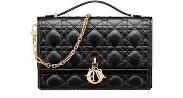Entdecke Diors Mini Miss Dior Tasche, Inbegriff der Eleganz mit ihrem markanten D.I.O.R.-Charm. Mit einer raffinierten Klappenverschluss bietet sie zwei Innenfächer, eine hintere Einstecktasche und drei Kartenfächer. Der Ledergriff und die abnehmbare Schmuckkette verleihen deinem Stil Vielseitigkeit.