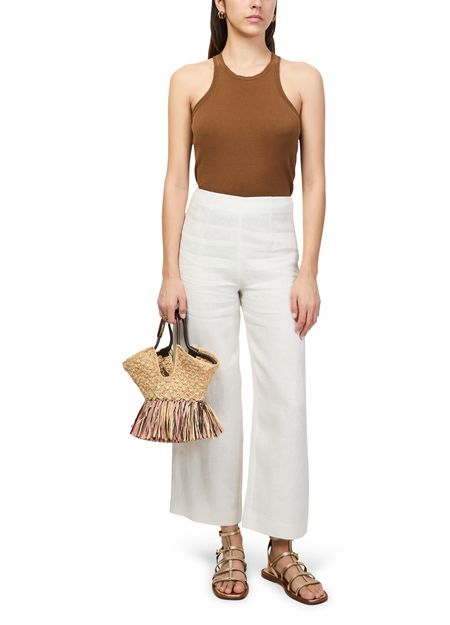 Genieße die Mini-Tragetasche Goldentime mit Fransen von Zimmermann, gefertigt aus durchbrochener Strickstruktur mit Doppelgriffen und dünnem, einstellbarem Trageriemen. Fransendetails und sichtbare Steppnähte verleihen dem großzügigen Einzelinnenfach einen stilvollen Akzent.