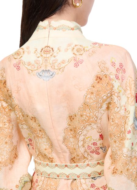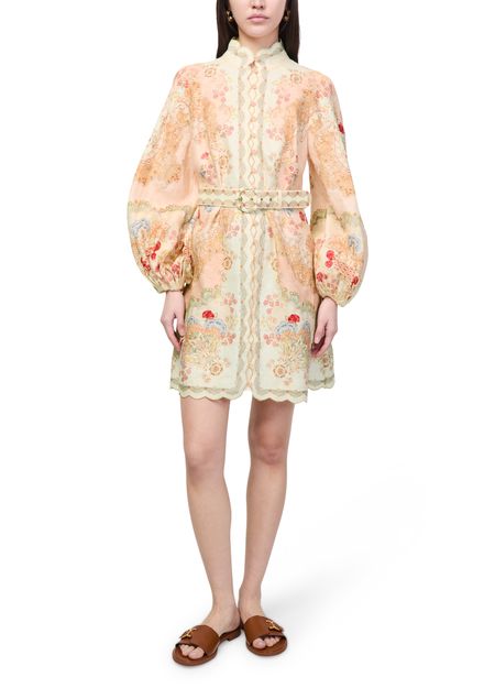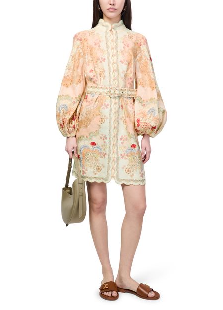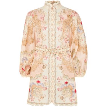 Genieße das Minikleid Daylight von Zimmermann mit floraler Musterung, hochgeschlossenem Ausschnitt und eng anliegenden langen Ärmeln. Stickdetails und gebogte Ränder verleihen dem Look Raffinesse, während der Reißverschluss am Rücken für einen modernen Abschluss sorgt – ideal für stilvolle Auftritte.
