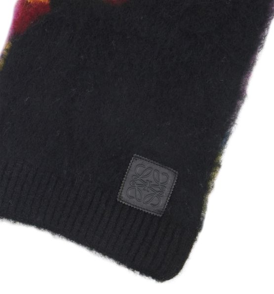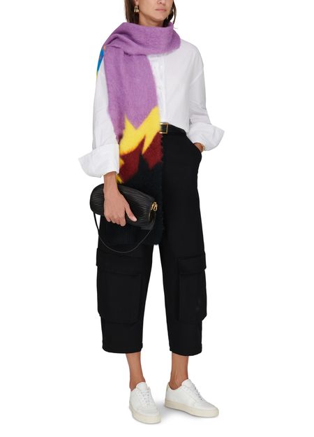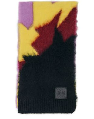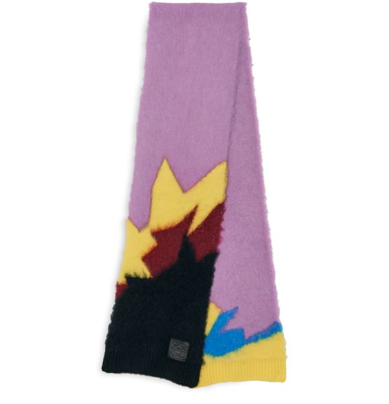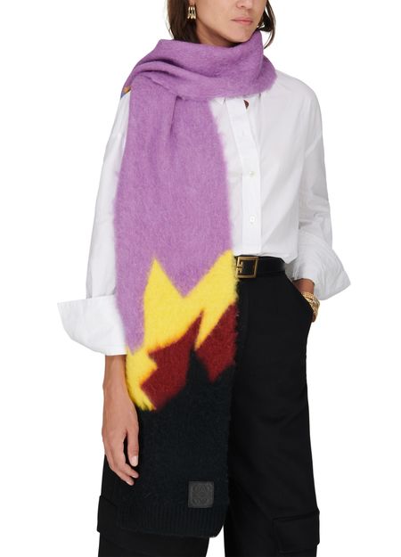 Der Schal Intarsia, der durch ein Etikett mit Wellenkanten hervorgehoben wird, das das geprägte Logo von Loewe trägt, bietet Frauen die Sanftheit seiner Textur und ein Jacquard-Muster mit großen bunten Bereichen.