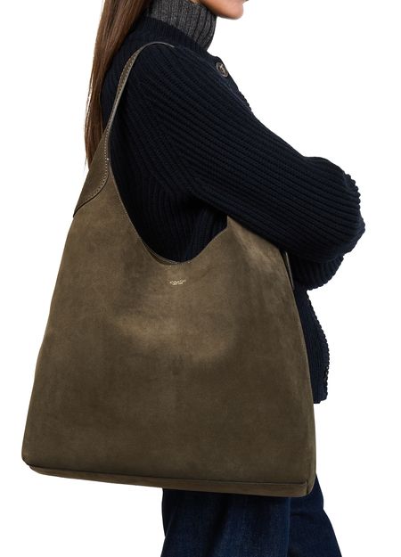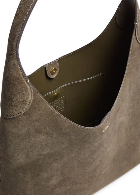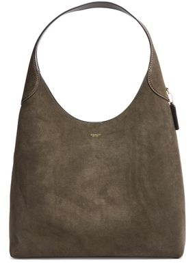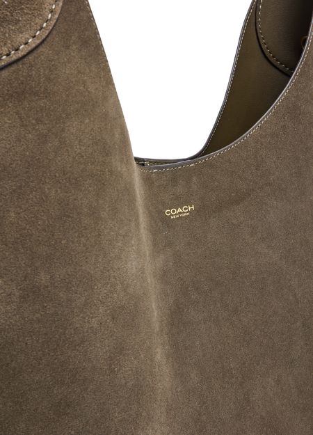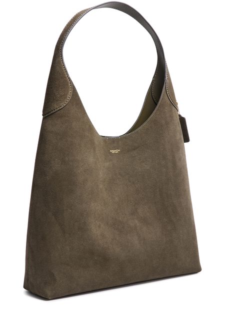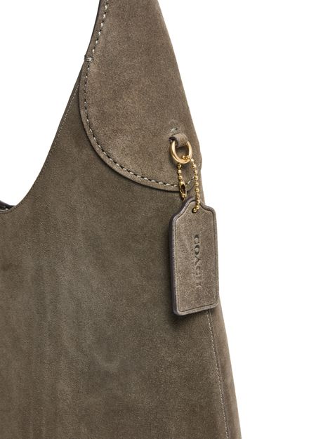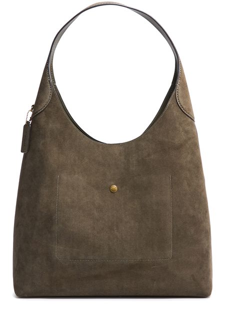Entdecke Coachs Schultertasche Brooklyn 39, ein Meisterwerk modernen Designs. Aus luxuriösem Veloursleder gefertigt, besticht diese Hobo-Tasche mit einem einzelnen Griff und sichtbaren Nähten. Der Druckknopf-Verschluss sichert ein geräumiges Inneres mit Lederfutter, ausgestattet mit einer Hintertasche und einer Innentasche für mühelose Organisation.