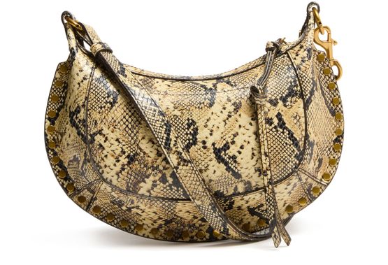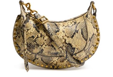 Erlebe Isabel Marant's Schultertasche Oskan Moon, ein Meisterstück modernen Designs. Diese Hobo-Tasche besticht durch ihr auffälliges Python-Muster und ein Logo in goldfarbenen Buchstaben. Der einstellbare, abnehmbare dünne Trageriemen bietet Vielseitigkeit, während der Reißverschluss und die Kartenschlitze im Inneren funktionale Eleganz hinzufügen.