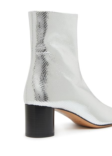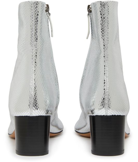 • Beschreibung : geschlossen, runde zehe, reißverschlussdetails, hoher schaft, pumps mit mittlerem absatz, reißverschluss an der seite, blockabsatz, silberfinish.