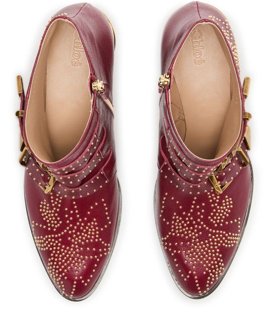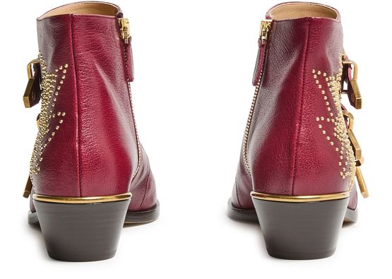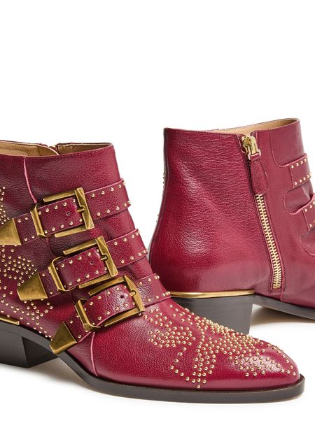 Genieße die genarbten leder-halbstiefel von Chloe mit spitz zulaufender, geschlossener Form und niedrigem Blockabsatz. Riemen mit Schnalle und seitlicher Reißverschluss sorgen für Komfort, während goldene Nietendetails und das gravierte Logo auf der Seite für einen markanten Akzent stehen.