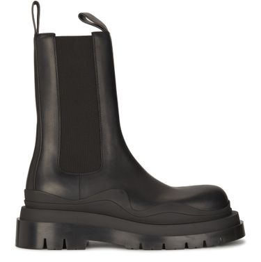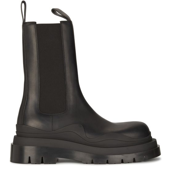 Bottega Veneta liefert seine moderne Neuinterpretation des Chelsea mit den gewagten Stiefeletten The Tire. Ihr sehr hoher Schaft, der mit zwei Schlaufen ausgestattet ist, ziert eine dicke, gekerbte Sohle.