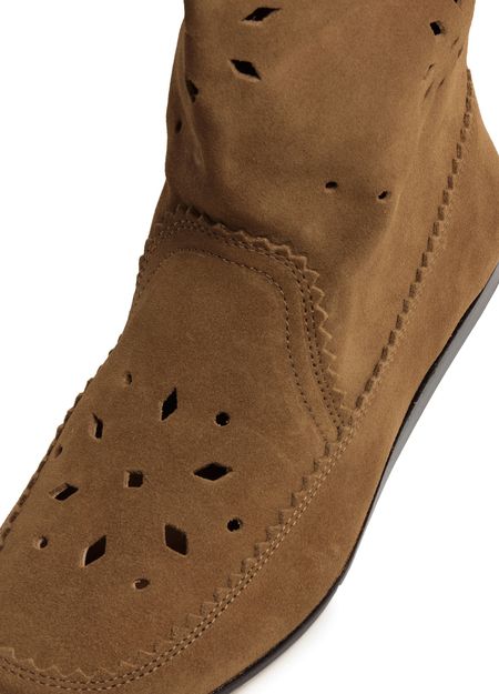 Genieße die Stiefeletten Welky von Isabel Marant aus weichem Veloursleder mit runder, geschlossener Spitze. Flacher Absatz und sehr dünne Sohle sorgen für Komfort, während sichtbare Nähte, grafische Cut-outs und Quastendetails einen modernen, stilvollen Akzent setzen.