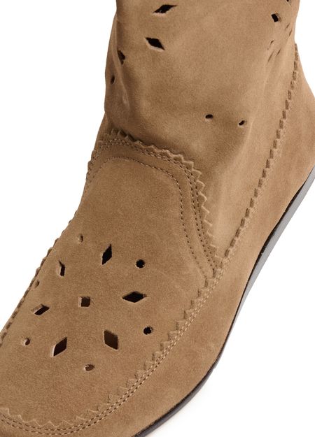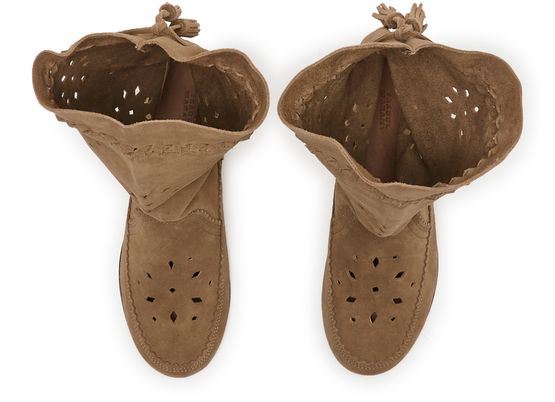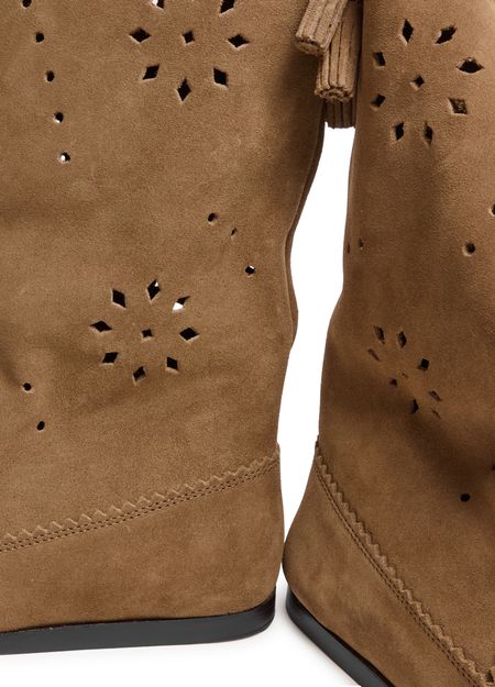 Genieße die Stiefeletten Welky von Isabel Marant aus weichem Veloursleder mit runder, geschlossener Spitze. Flacher Absatz und sehr dünne Sohle sorgen für Komfort, während sichtbare Nähte, grafische Cut-outs und Quastendetails einen modernen, stilvollen Akzent setzen.