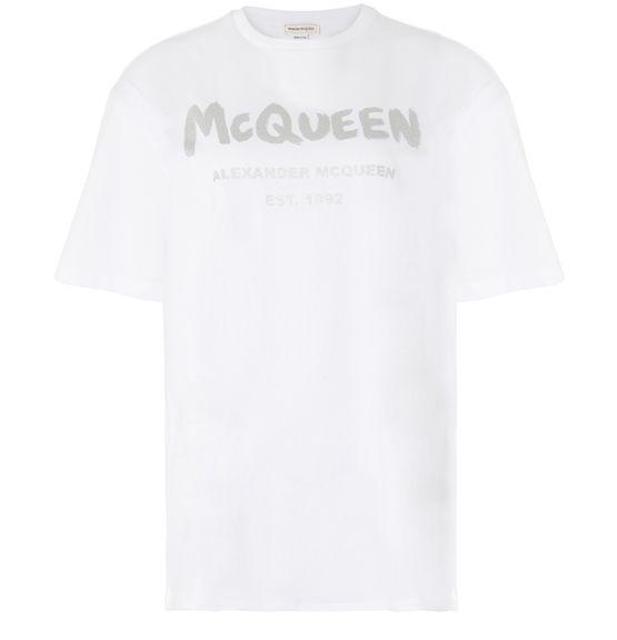 Der gerade und weite Schnitt des T-Shirts McQueen Graffiti ist eine Einladung zu einem bequemen Outfit mit kurzen Ärmeln und einem Rundhalsausschnitt.