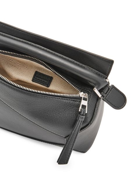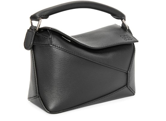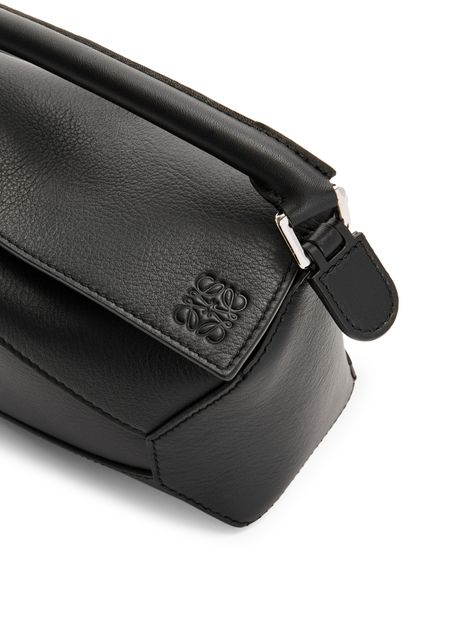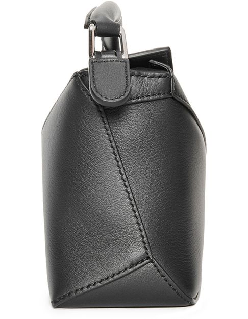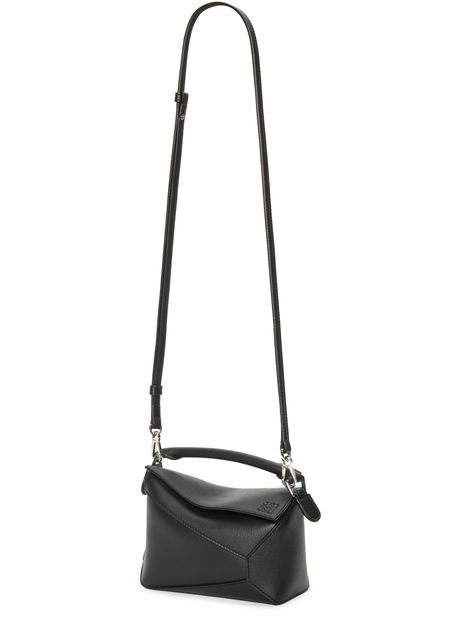 Genieße die Tasche Puzzle Edge Mini von Loewe, gefertigt aus glattem Leder mit Medaillon Anagram und Silberfinish. Dünner, einstellbarer und abnehmbarer Tragegurt sowie einzelner Griff sorgen für flexible Tragemöglichkeiten. Sichtbare Nähte, geprägtes Logo und Reißverschluss unterstreichen das stilvolle Design.