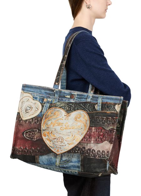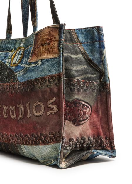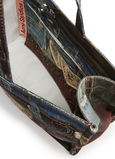 Entdecke Acne Studios' Tragetasche mit Trompe-l'œil-Print und Denim-Effekt, eine perfekte Mischung aus Stil und Funktionalität. Diese Schultertasche verfügt über einen allover-Druck, doppelgriffe und einen Drehverschluss. Mit einem einzelnen Fach und einer offenen Innentasche bietet sie sowohl Eleganz als auch Praktikabilität.