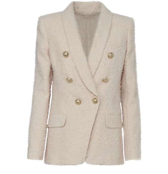 Die Tweedjacke mit langen Ärmeln ist ein anspruchsvolles Stück des Modehauses Balmain. Der Reverskragen und die militärischen Knöpfe verleihen ihm einen unbestreitbaren Stempel.