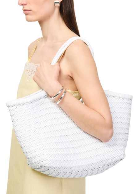 Erlebe die Korbtasche Nantucket von Dragon Diffusion mit doppelgriff und geprägtem logo auf der vorderseite. Das großzügige Design verbindet moderne Raffinesse mit Funktionalität – ein stilvolles Accessoire für anspruchsvolle Looks im Alltag.