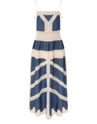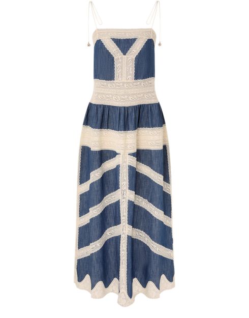 Reveal Zimmermann's Awaken denim négligée dress, crafted from faded denim for a contemporary edge. The rectangular neckline and sleeveless silhouette are complemented by delicate lace details and shoulder straps. A back zipper closure ensures a sleek fit, making this piece perfect for both daytime outings and evening events.