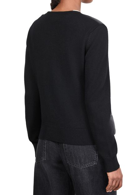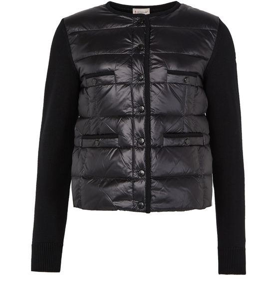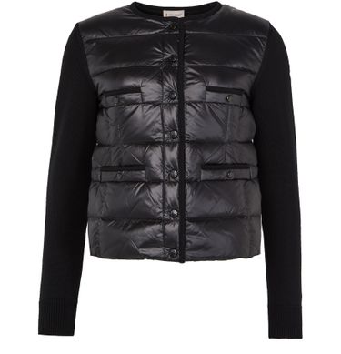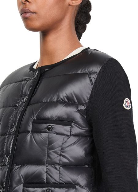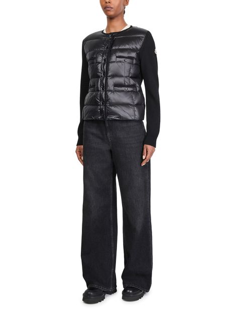 Reveal Moncler's bi-material jacket, a short, long-sleeved masterpiece with a striking logo on the side and a sophisticated button fastening.