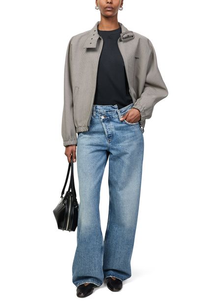 Reveal Courreges's buckle houndstooth bomber jacket, a short, modern silhouette with a high neck and long sleeves. The zipper and button fastening add a sleek touch, while welt pockets and an embroidered chest logo elevate its appeal. Perfect for versatile styling, from day to night.