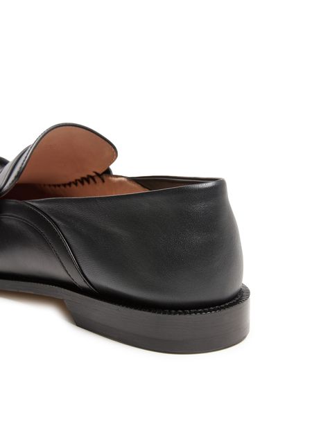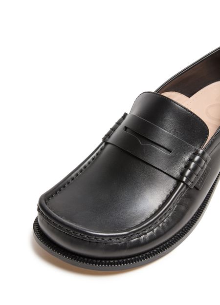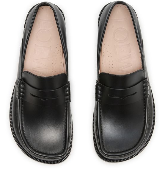 Unveil Loewe's Campo loafers in calf leather, a perfect blend of elegance and comfort. Featuring a closed square toe and flat heel, these loafers boast smooth leather with visible stitching. The embossed logo on the side adds a touch of sophistication, while the leather insole ensures all-day comfort.