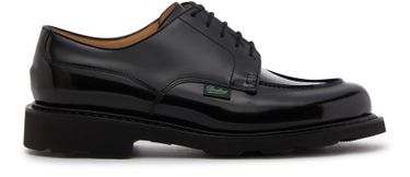 Introducing Paraboot's Chambord derbies, a refined choice featuring a low block heel and embossed logo. Crafted with a contrasting sole and visible stitching, these lace-up shoes offer a classic round toe and closed design, perfect for stylish comfort.
