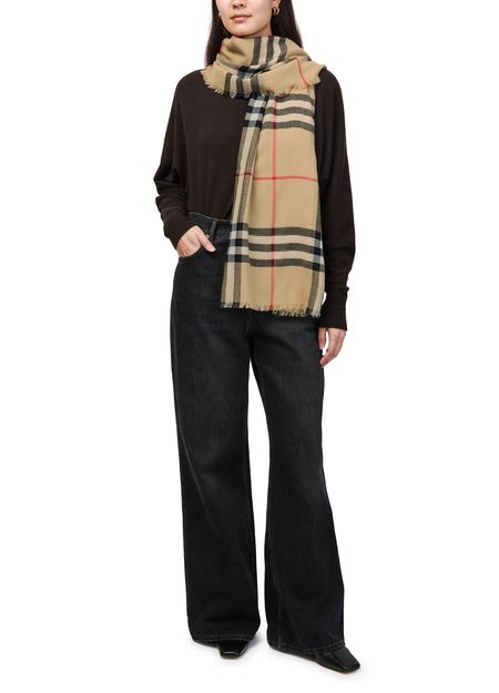 Reveal Burberry's check cashmere scarf, featuring fringed edges and a printed logo for a refined finish. This timeless accessory effortlessly elevates any ensemble, blending classic design with modern flair for a statement look.